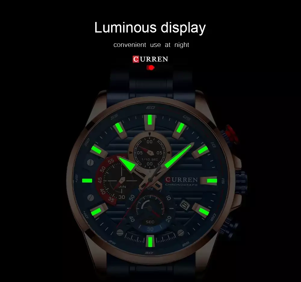 Equipado com movimento Quartz de alta precisão, visor resistente em Hardlex e resistência à água de 3BAR, esse modelo oferece durabilidade e praticidade para o dia a dia. Seus recursos avançados, como cronógrafo, data automática e ponteiros luminosos, garantem funcionalidade completa para acompanhar sua rotina com estilo.